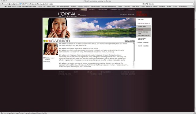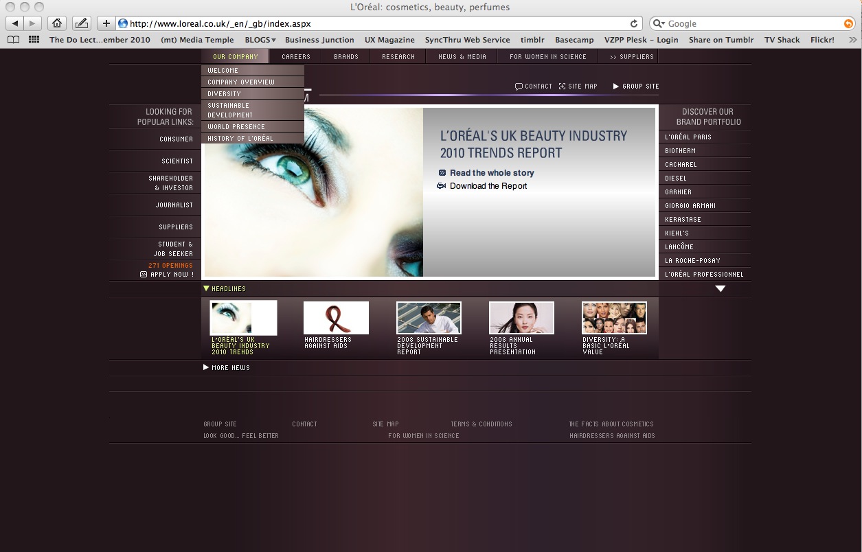 L’Oreal are number 44 in the world’s top 100 brands for 2009 and worth $7748 million (according to Interbrand). Their website looks like they spent £5000 on it at their local ‘Jark Website Solutions Company’ run by Mark and John, two computer science graduates who love drop down menus and 800 x 600 resolution websites and who spend hours telling their clients about their ISO 9001 accreditation.